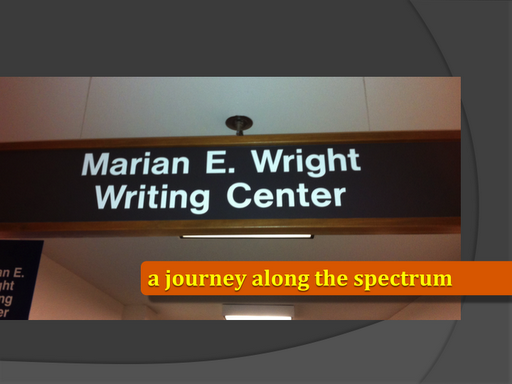For no other reason than because it felt like something to do, I’m posting what I presented Saturday, November 5 at 8am during the National Conference on Peer Tutoring in Writing. For those of you unfamiliar with the format, I modeled it loosely after the format seen here, although I did not autotime the slides and used some very minimalist wording for takeaways – that’s why it’s so graphic heavy and so text-light. The text is the (approximate) script I used to accompany the slide you’ll see with it.