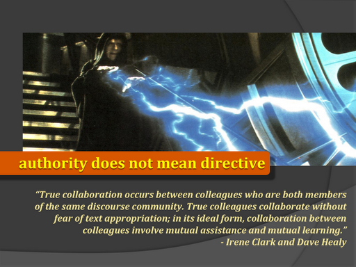 Just because a tutor has authority, that does not mean the tutor should be authoritarian. A tutor has the opportunity to introduce the writer to a two-way conversation about writing: suggestions are made, arguments are examined, and content is weighed, but all decisions to revise remain ultimately with the text’s owner. Two writers discussing a spectrum of writing options while maintaining the authority of both contributors is pure collaboration. How does the tutor define the boundaries of that spectrum, and of that collaboration?