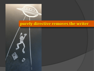 But purely directive removes the writer. If a writer hasn’t turned to you for direction, or needs only a little nudge, there’s a fine line for the tutor between making a suggestion and taking over.  Being too directive can preempt the writer’s invention process, mute their voice, and rob them of their stake in the outcome. Instead of showing the writer what they can do to write better, you’ve only shown them how you write better.