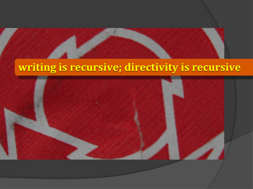 We tell our writers that writing is a recursive process that moves back and forth along invention, drafting, and revision constantly. The journey along the spectrum of directivity is not a straight line, but a path that twists back on itself. Starting minimalist and going directive doesn’t mean the tutor has to stay directive. If the session needs to start directive, it doesn’t mean the tutor can’t put the power back in the writer’s hands by offering more minimalist input later.